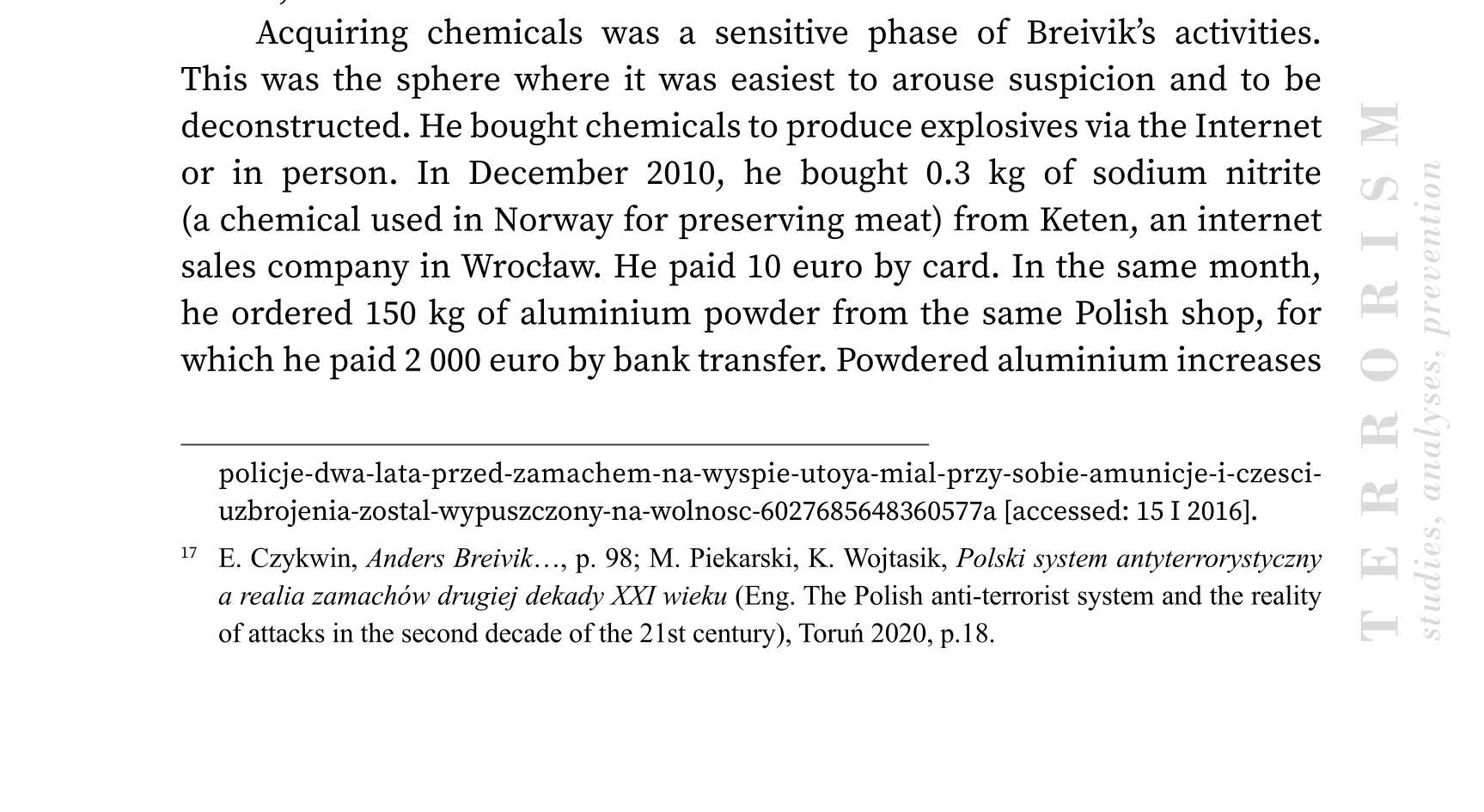 Media some time ago had reported that members of Neo-Nazi group far-right has been arrested along with Jurg S. The most recent findings are showing that these Neo-Nazi group conducted training's with firearms in Poland and in the Czech Republic. On these occasion its worth to remind that Anders Behring Breivik found easy to acquire illegally a firearm in the Czech Republic even tough eventually he did not purchase any. At the same time he successfully bought chemicals in Poland to produce explosives 0.3 kg of sodium nitrite from Keten, shop in Wroclaw, Poland and 150 kg of aluminum powder.