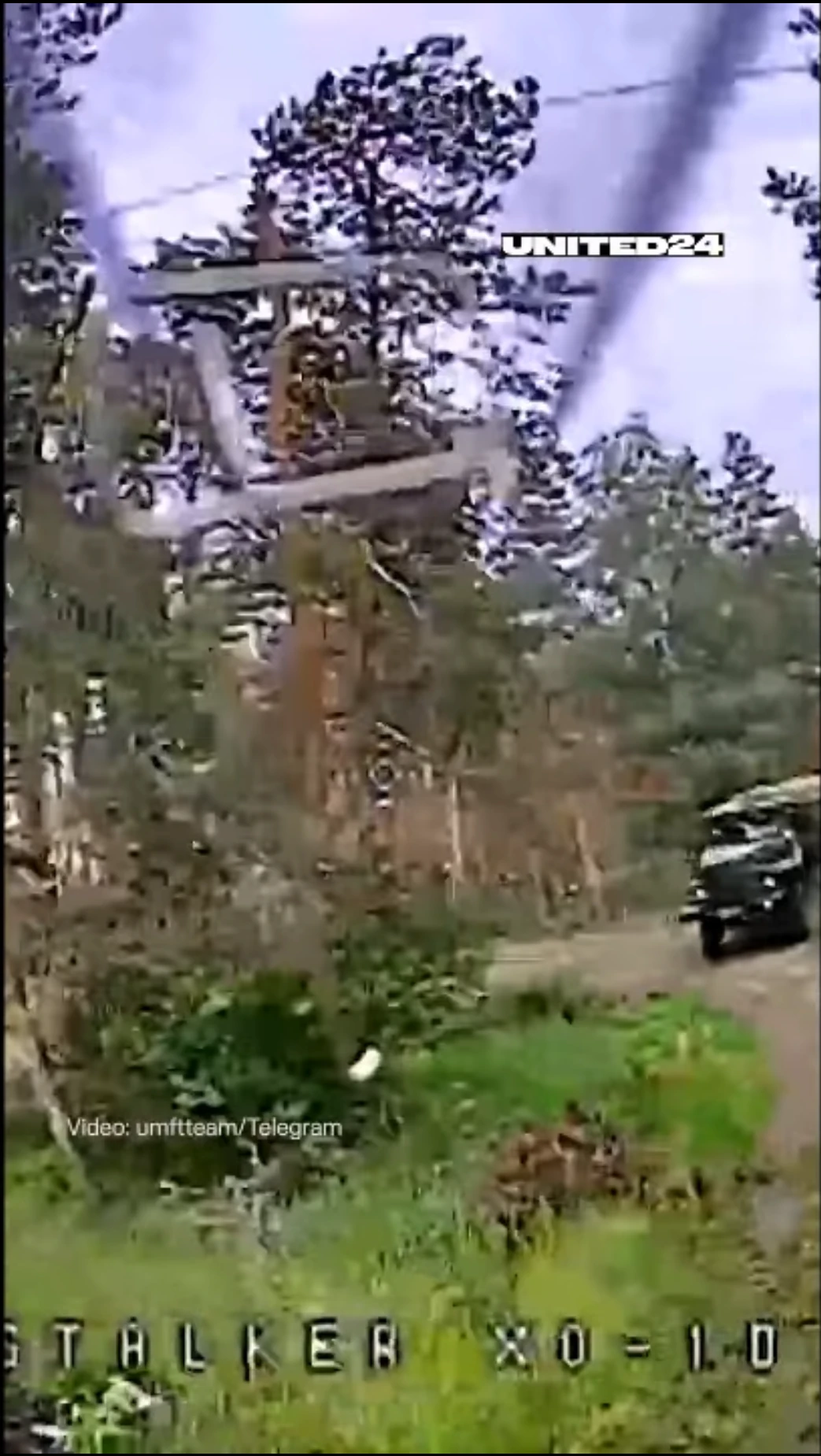 On the first footage Russian soldier attempts to place a mine type TM-62 when is being spotted by a observation drone and hit by assault drone. On the second footage drone hits in the wood a truck with Russian soldiers. It is being clearly seen that Russians are attempting to evacuate themselves from vehicle.