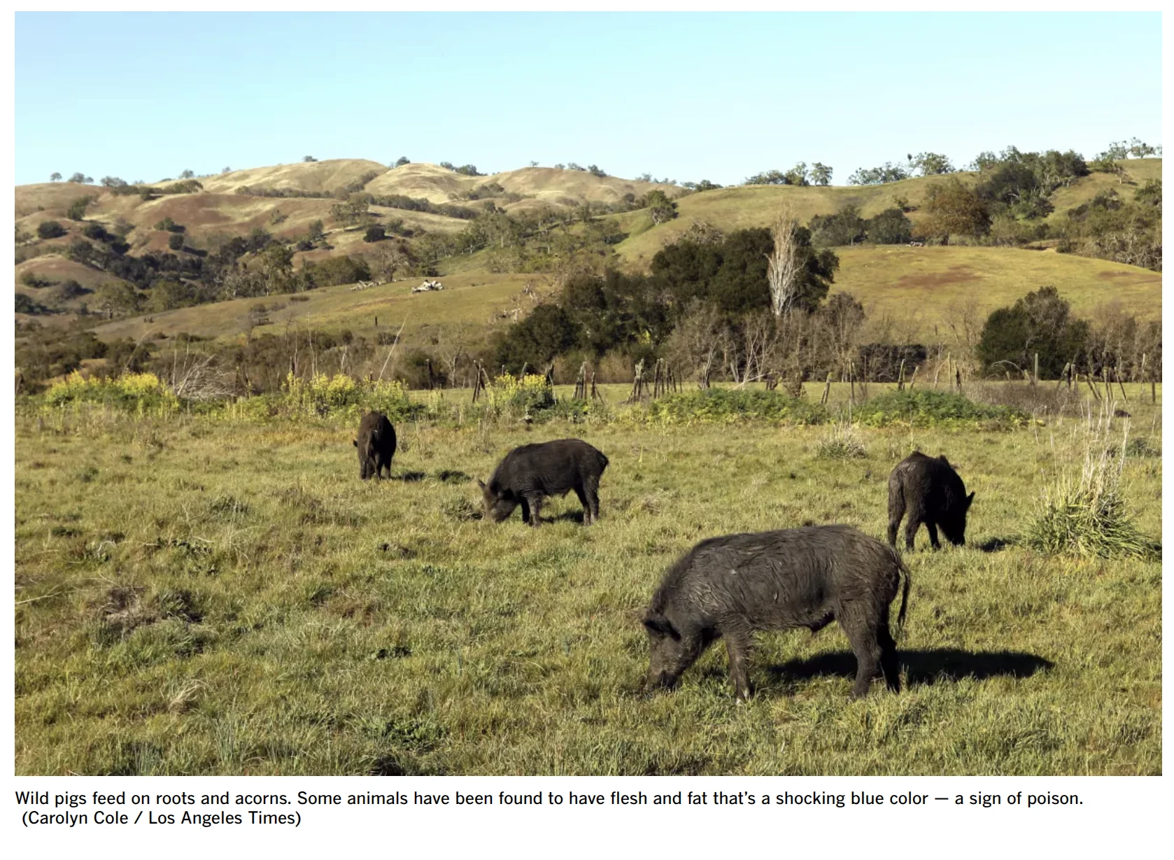 Media reports that in California, United States, has been found a Boars which have blueish meat fat and blueish meat pigmentation. It has been determinated that this Boars were eating Rodenticide baits which were used to kill small pests. The Rodenticide baits were containing poisonous diphacinone. California Department of Fish and Wildlife had said that they were aware of exposure of boars on rat poison since March, this year.