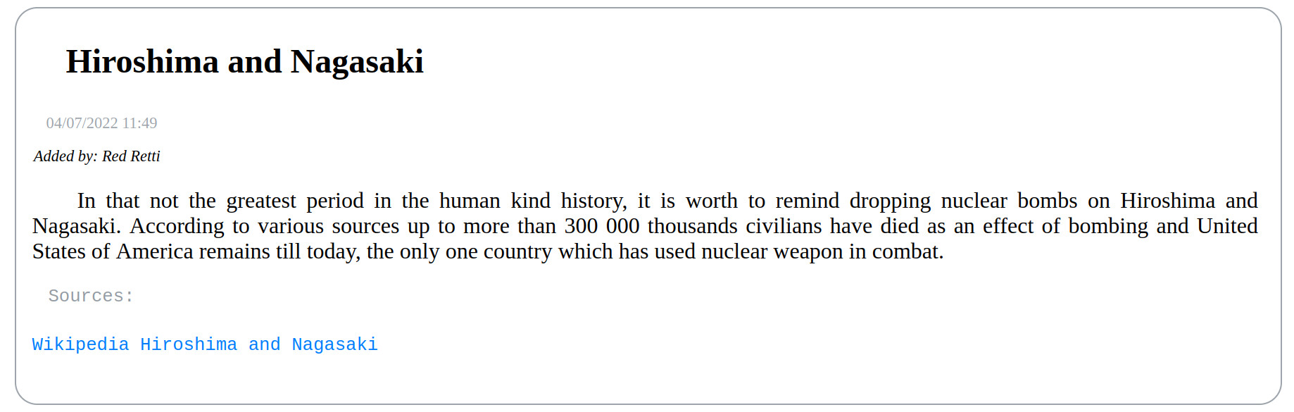 In that not the greatest period in the human kind history, it is worth to remind dropping nuclear bombs on Hiroshima and Nagasaki. According to various sources up to more than 300 000 thousands civilians have died as an effect of bombing and United States of America remains till today, the only one country which has used nuclear weapon in combat.