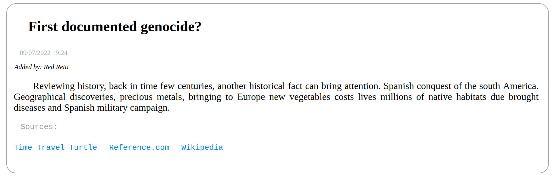 Reviewing history, back in time few centuries, another historical fact can bring attention. Spanish conquest of the south America. Geographical discoveries, precious metals, bringing to Europe new vegetables costs lives millions of native habitats due brought diseases and Spanish military campaign.