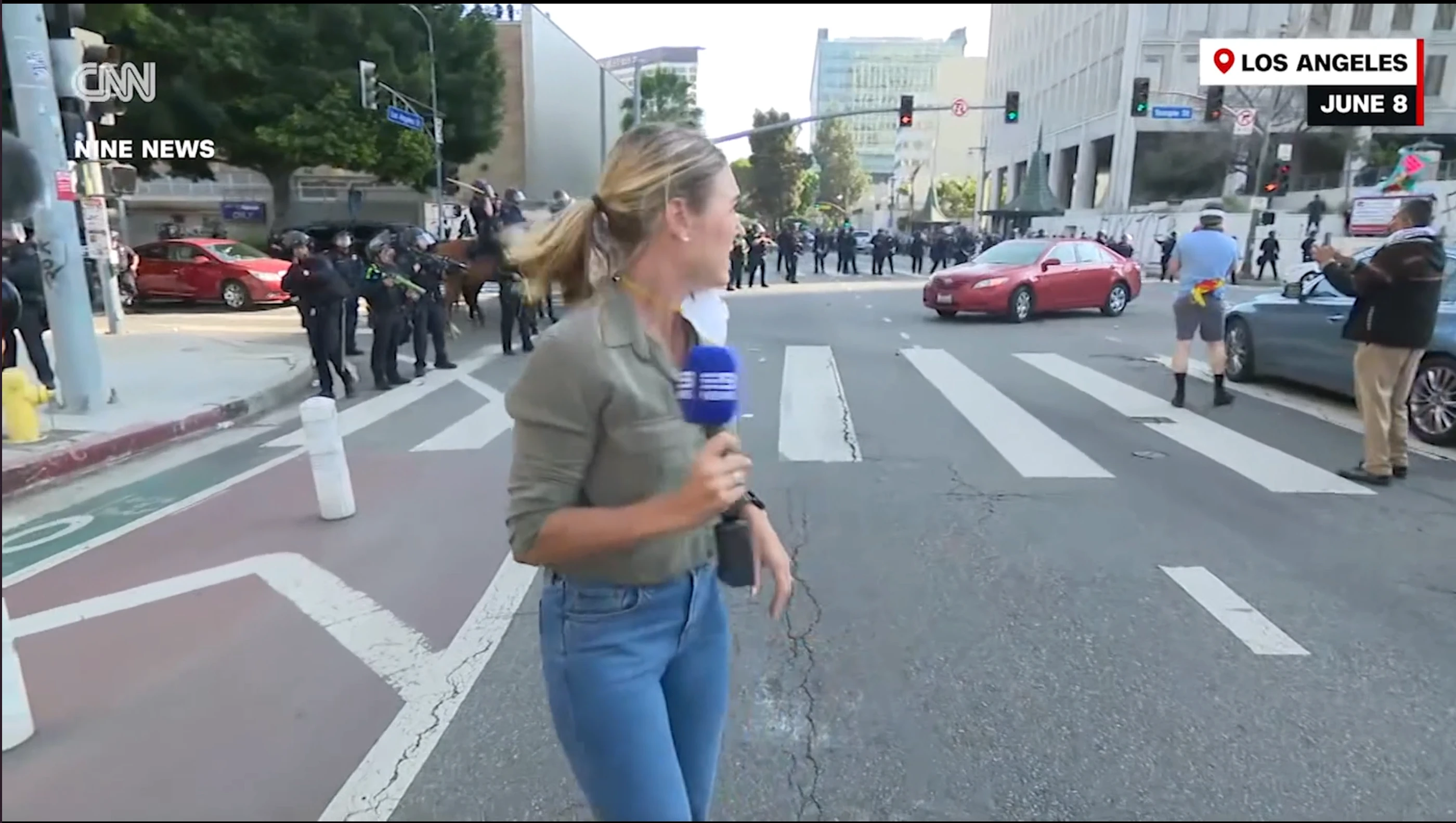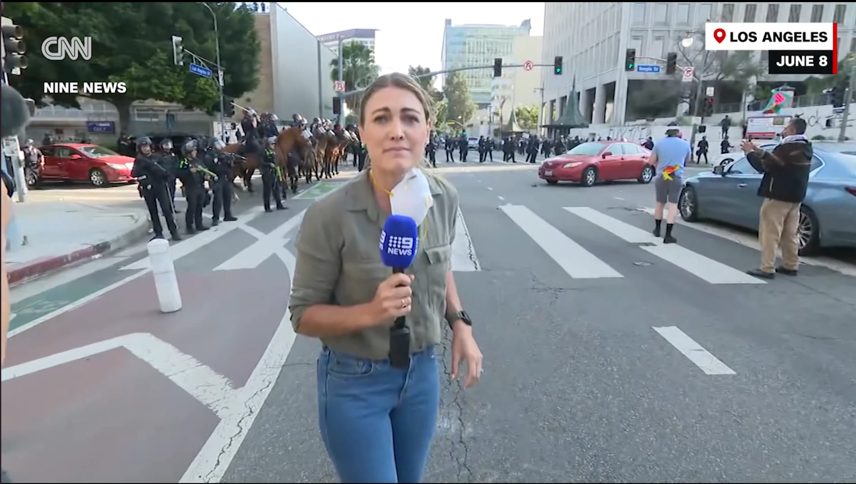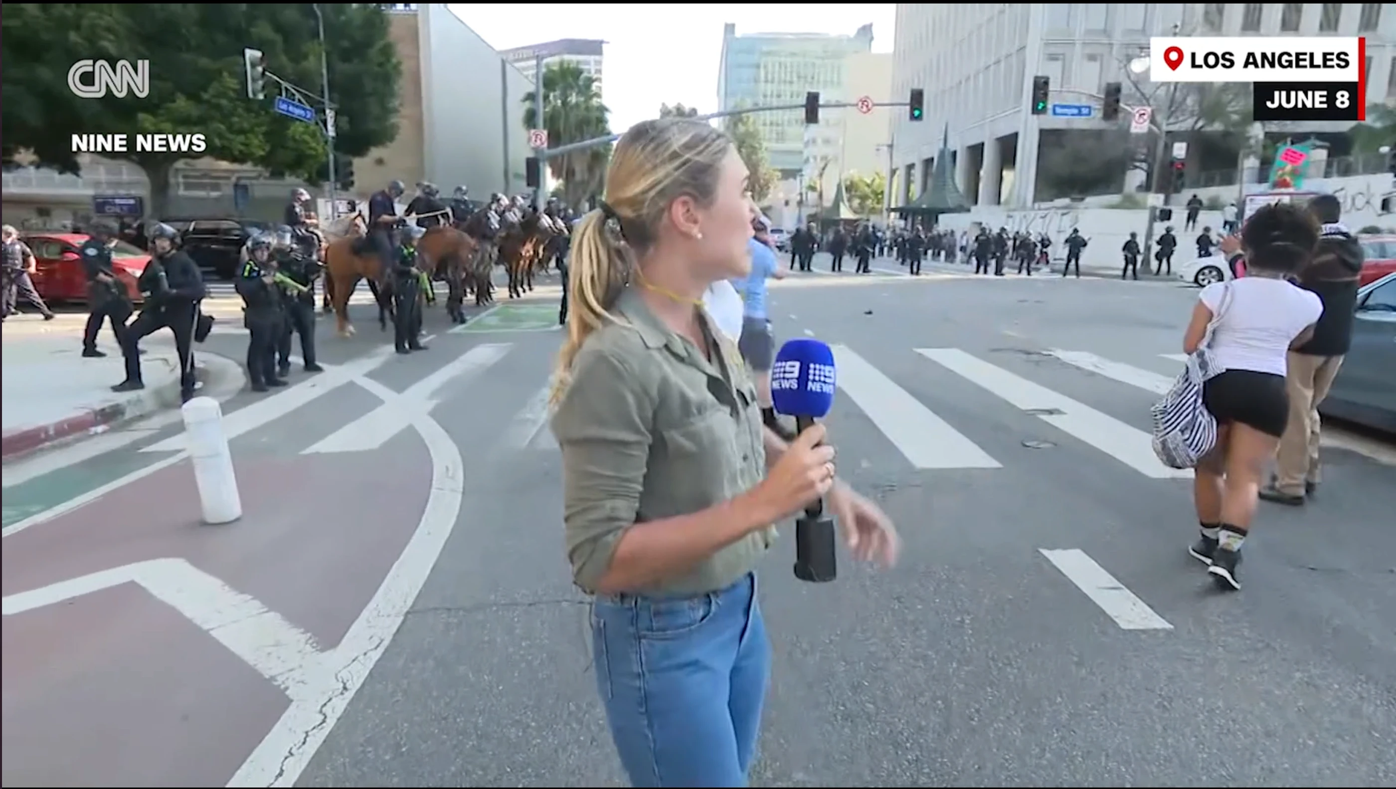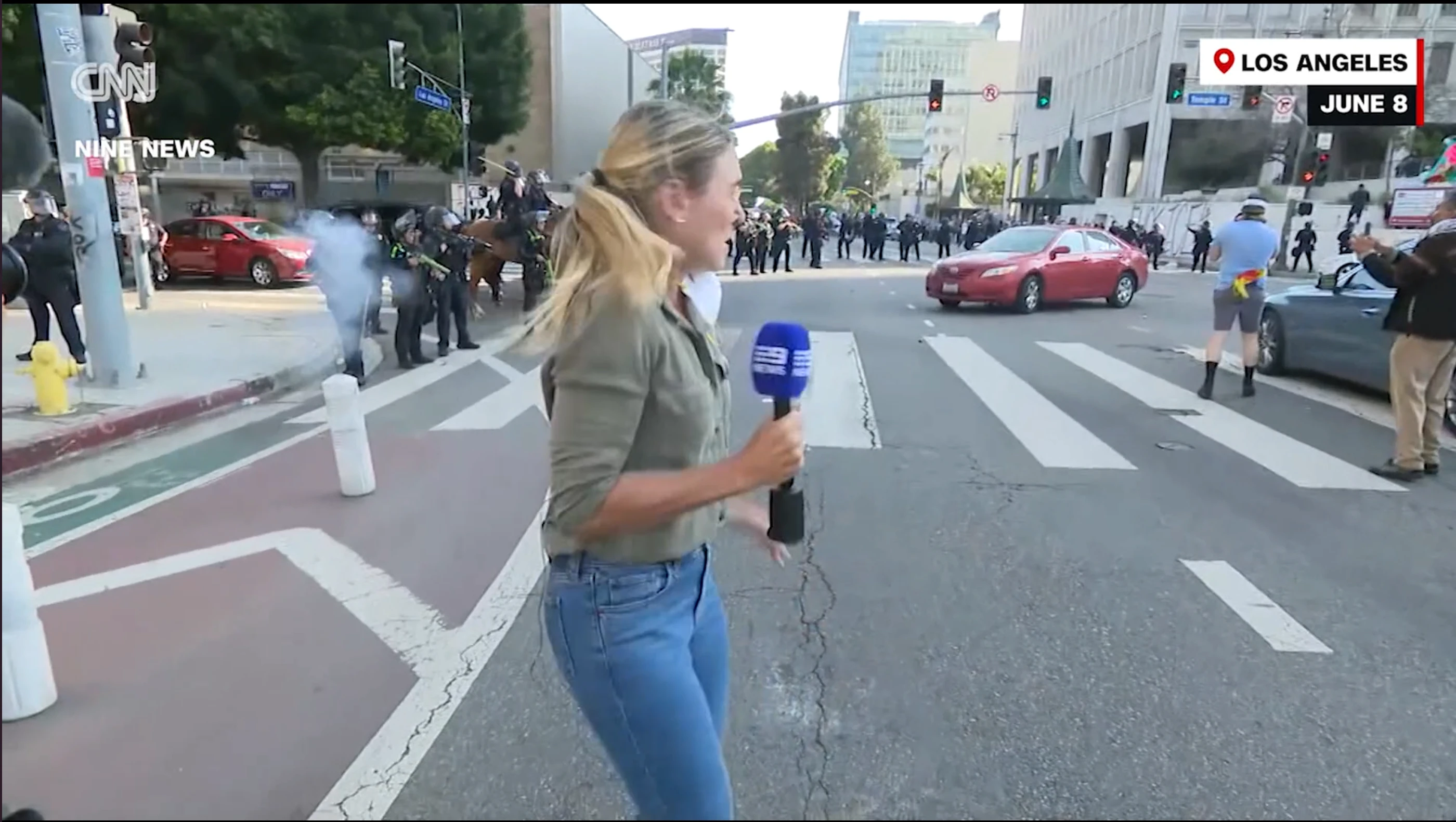 Australian reporter Lauren Tomasi hit by gum bullet in Los Angeles, shoot by police officer, during documenting riots. The protests and riots are caused by President Donald Trump’s immigration crackdown.