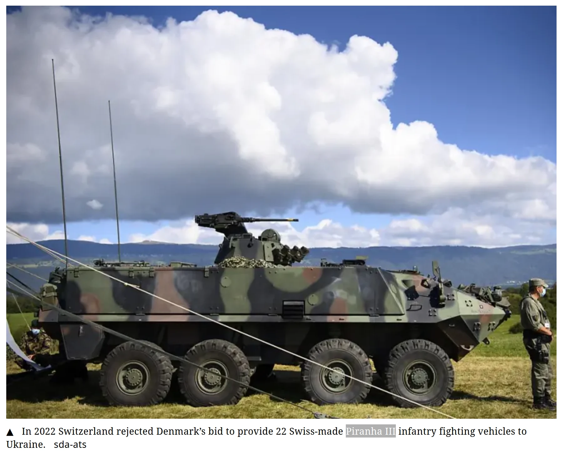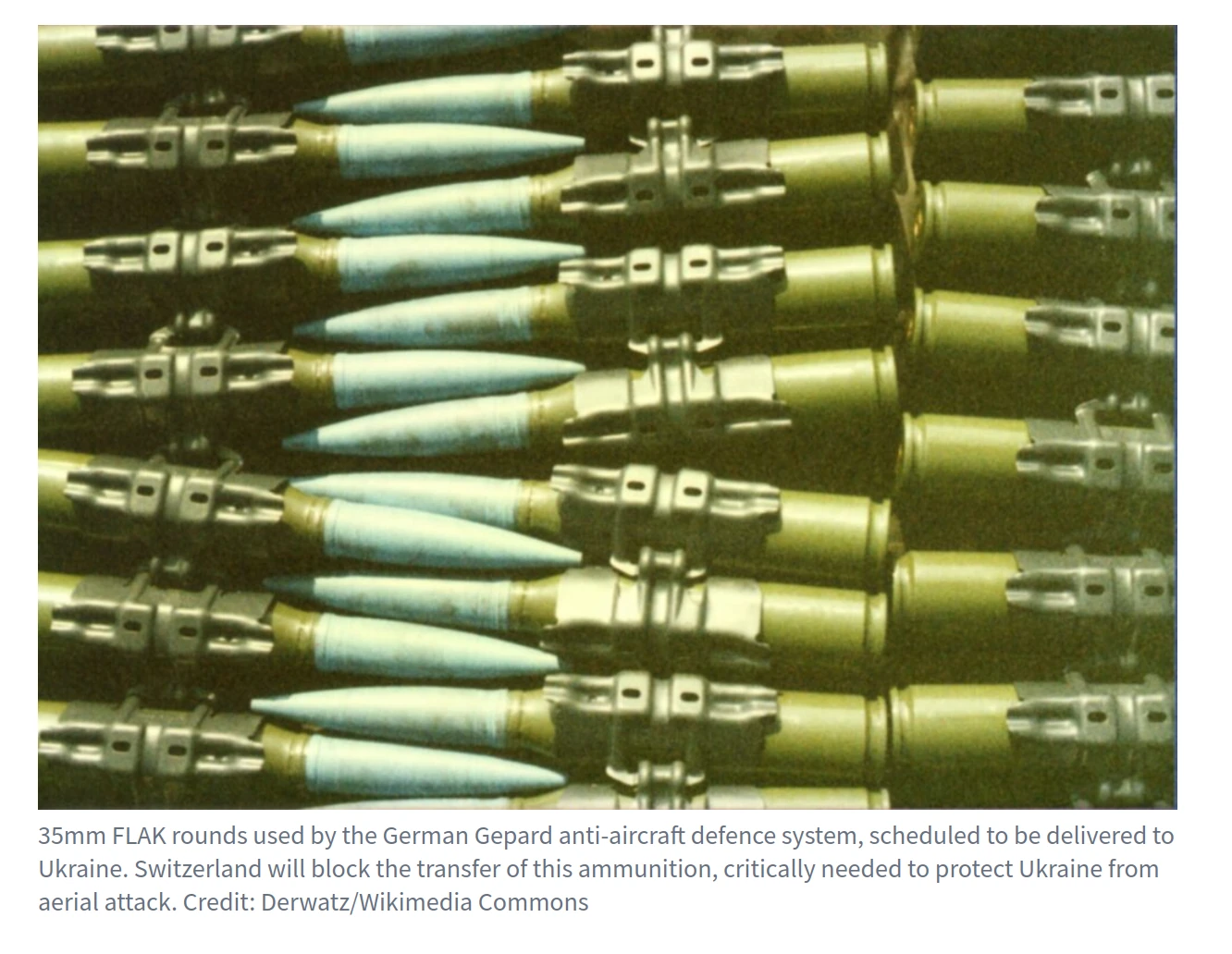 It is know that Switzerland is a neutral state and also have a law forbidding re-export of weapon and ammunition to conflict zones. So far Switzerland had blocked weapon and ammunition supplies which intended to be delivered to Ukraine by many countries e.g. ammunition bought by Poland and delivered to Ukraine, ammunition for anti-air defense “Gepard” system which Germans intended to deliver to Ukraine, armored personnel carriers Piranha III which Denmark intended deliver to Ukraine.