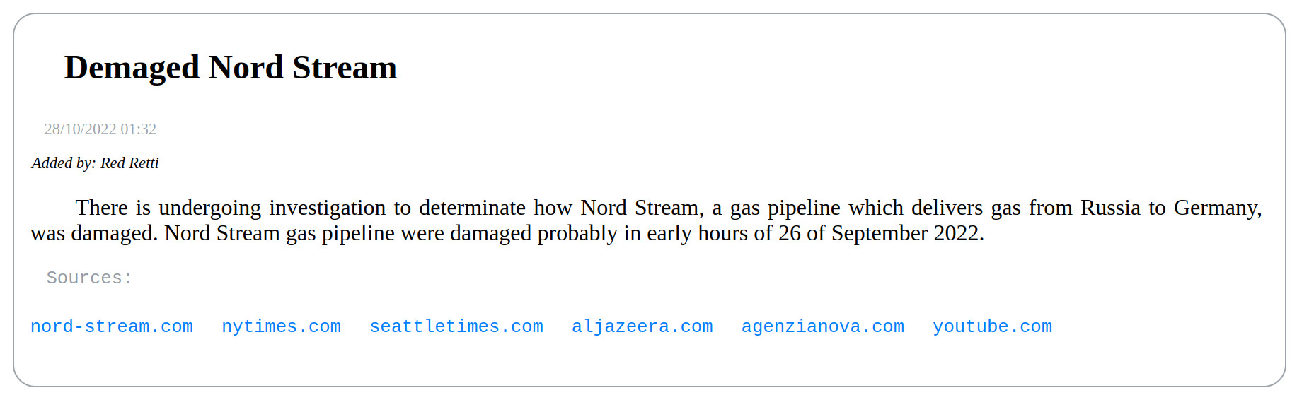 There is undergoing investigation to determinate how Nord Stream, a gas pipeline which delivers gas from Russia to Germany, was damaged. Nord Stream gas pipeline were damaged probably in early hours of 26 of September 2022.