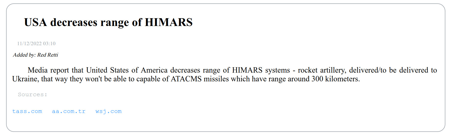 Media report that United States of America decreases range of HIMARS systems - rocket artillery, delivered/to be delivered to Ukraine, that way they won't be able to capable of ATACMS missiles which have range around 300 kilometers.
