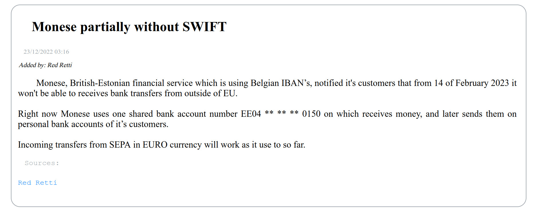 Monese, British-Estonian financial service which is using Belgian IBAN’s, notified it's customers that from 14 of February 2023 it won't be able to receives bank transfers from outside of EU. Right now Monese uses one shared bank account number EE04 ** ** ** 0150 on which receives money, and later sends them on personal bank accounts of it’s customers. Incoming transfers from SEPA in EURO currency will work as it use to so far.