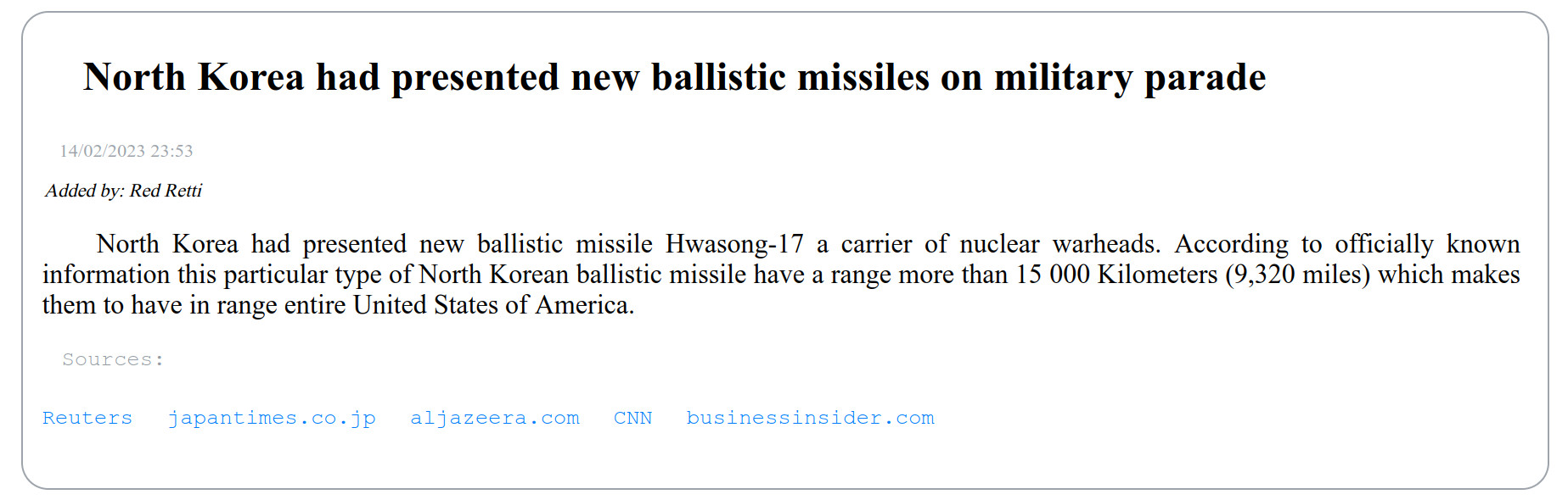 North Korea had presented new ballistic missile Hwasong-17 a carrier of nuclear warheads. According to officially known information this particular type of North Korean ballistic missile have a range more than 15 000 Kilometers (9,320 miles) which makes them to have in range entire United States of America.