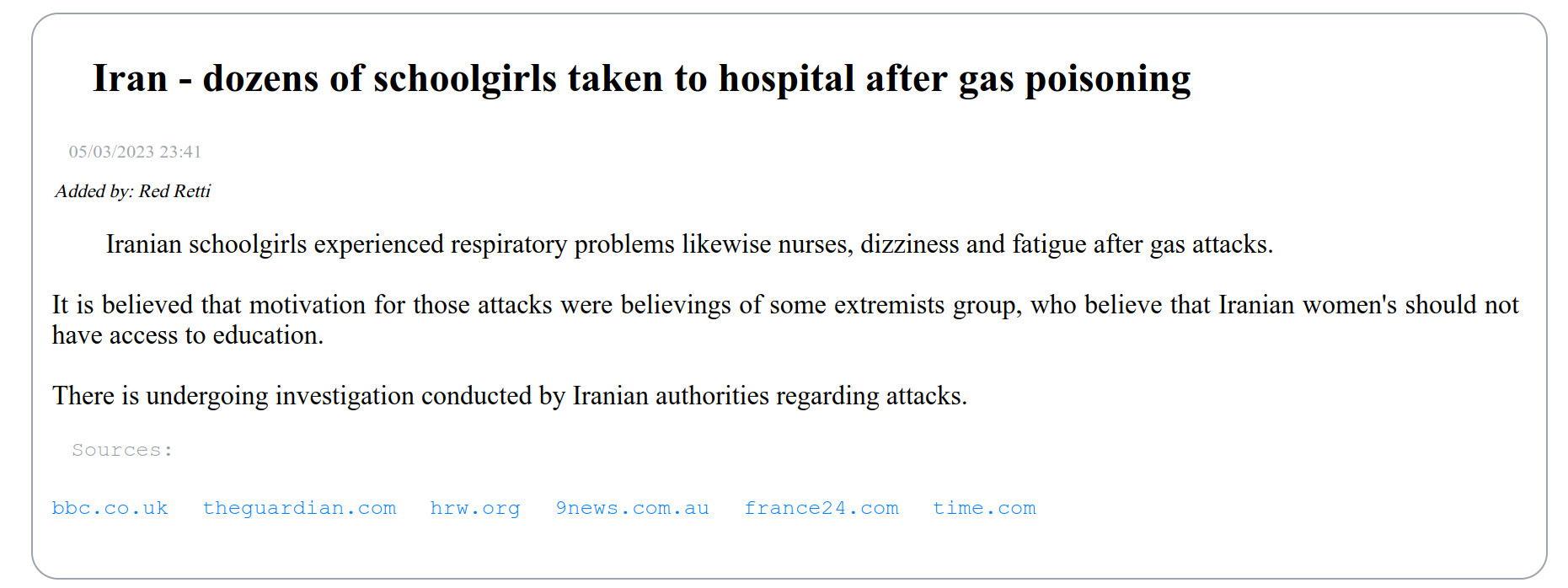 Iranian schoolgirls experienced respiratory problems likewise nurses, dizziness and fatigue after gas attacks. It is believed that motivation for those attacks were believings of some extremists group, who believe that Iranian women's should not have access to education. There is undergoing investigation conducted by Iranian authorities regarding attacks.
