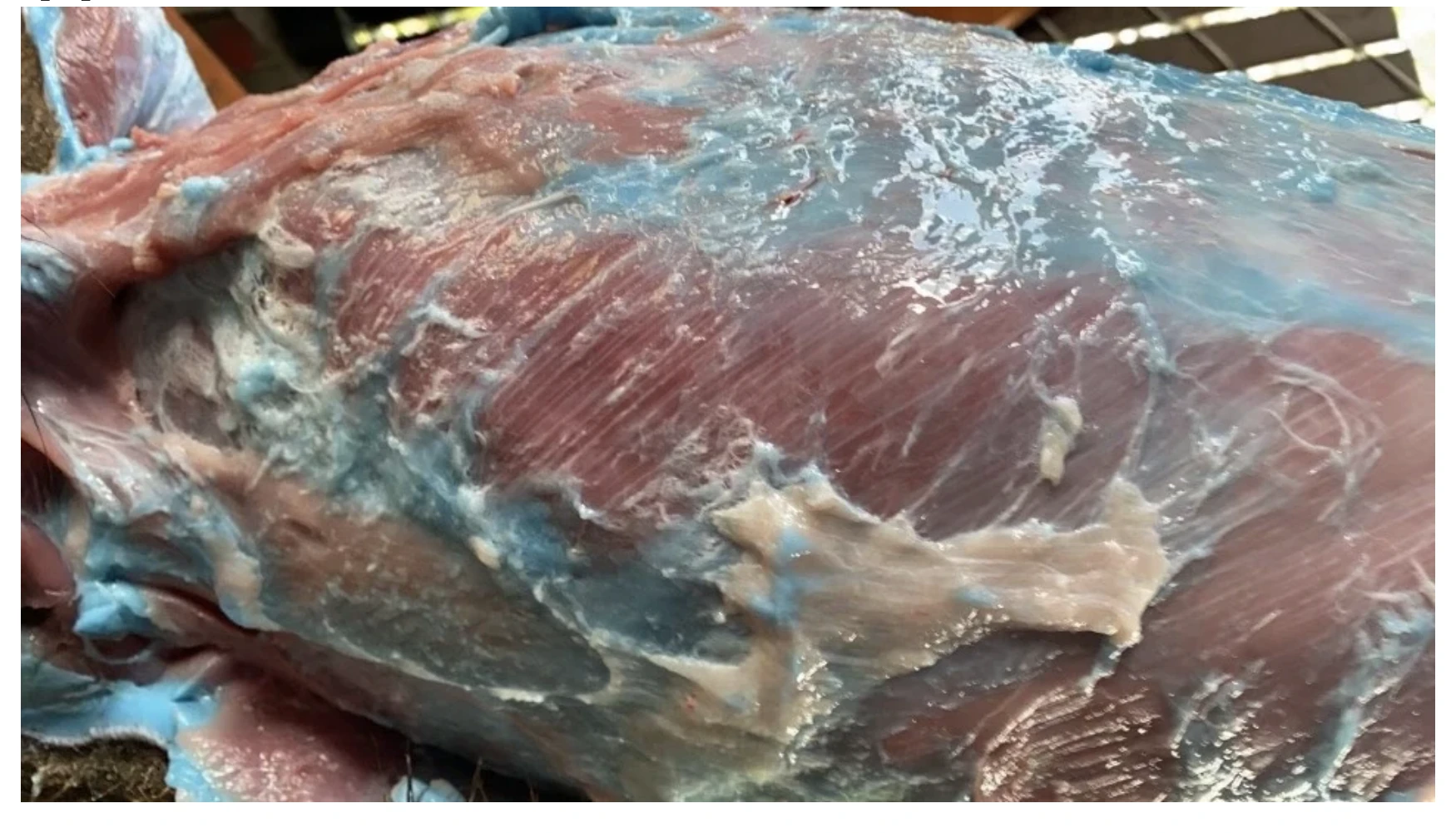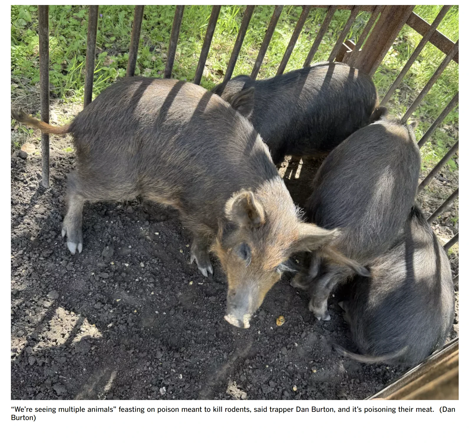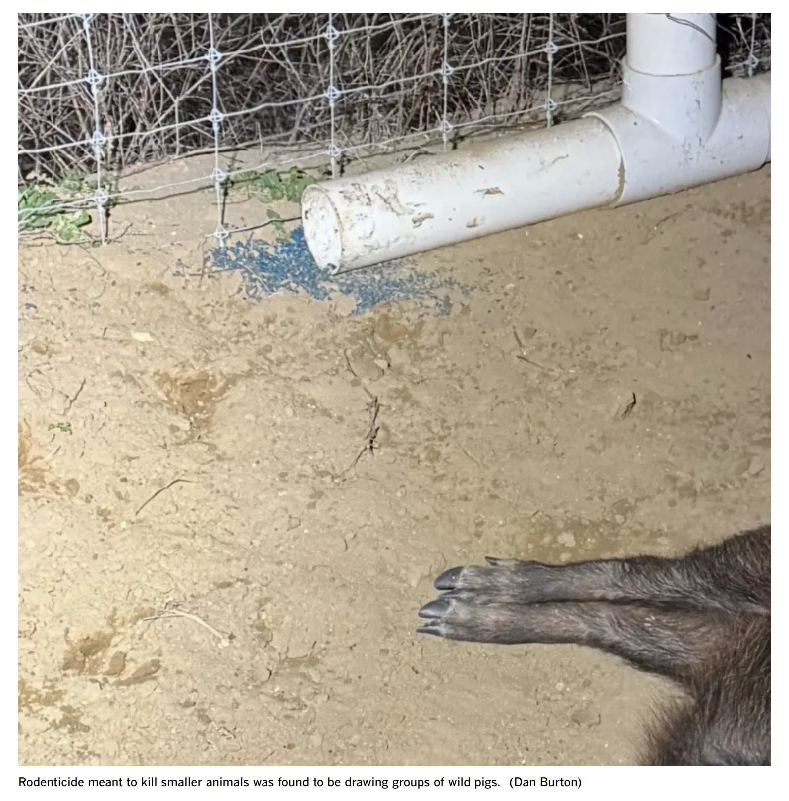 Media reports that in California, United States, has been found a Boars which have blueish meat fat and blueish meat pigmentation. It has been determinated that this Boars were eating Rodenticide baits which were used to kill small pests. The Rodenticide baits were containing poisonous diphacinone. California Department of Fish and Wildlife had said that they were aware of exposure of boars on rat poison since March, this year.