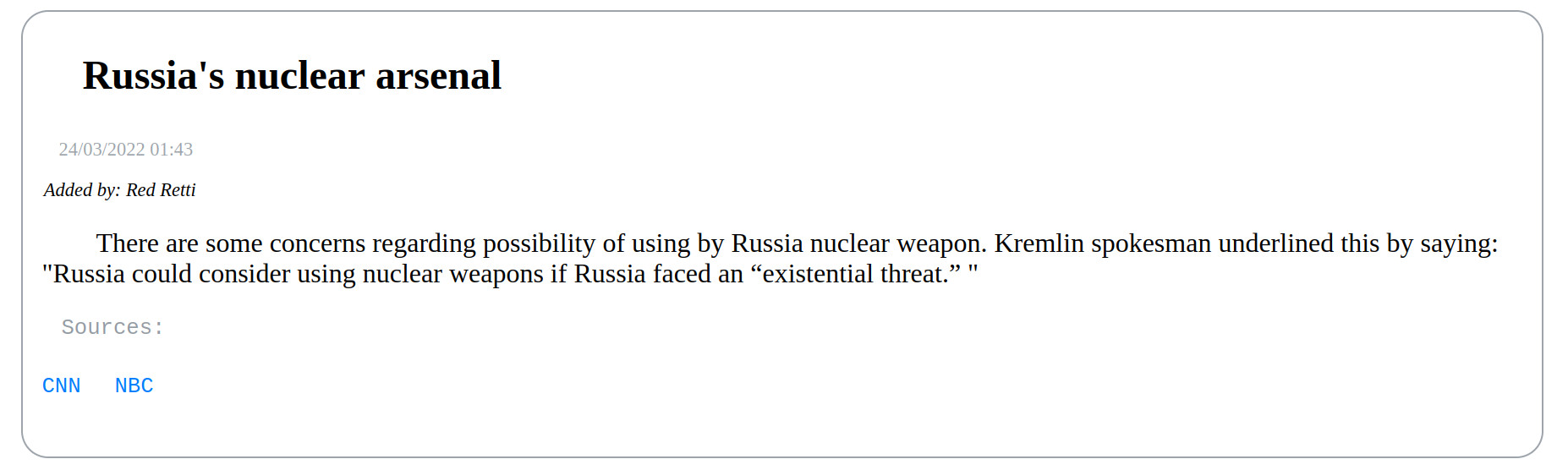 There are some concerns regarding possibility of using by Russia nuclear weapon. Kremlin spokesman underlined this by saying: "Russia could consider using nuclear weapons if Russia faced an “existential threat.” "
