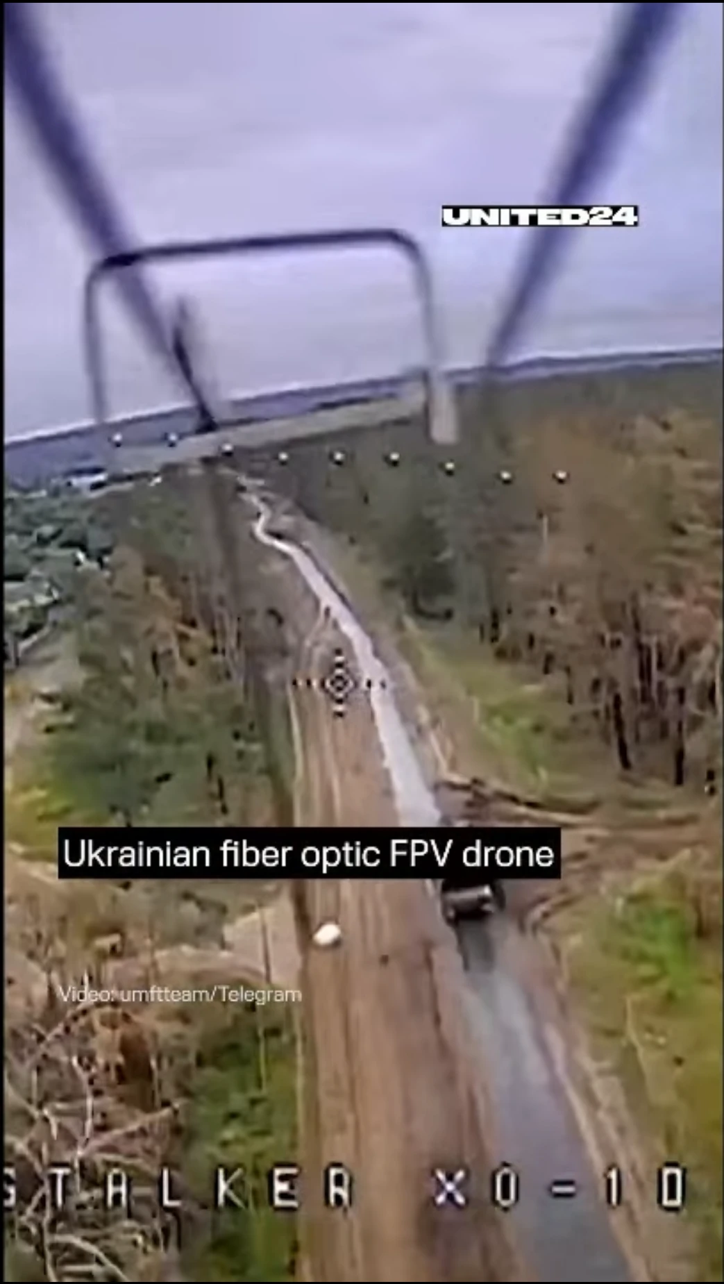 On the first footage Russian soldier attempts to place a mine type TM-62 when is being spotted by a observation drone and hit by assault drone. On the second footage drone hits in the wood a truck with Russian soldiers. It is being clearly seen that Russians are attempting to evacuate themselves from vehicle. Third footage shows Buggie carrying soldiers being hit by a drone. The fourth one, shows how drone finds a tank hidden in shelter made from wood beams in the wood. The same drone hits a tank and possible destroy it.