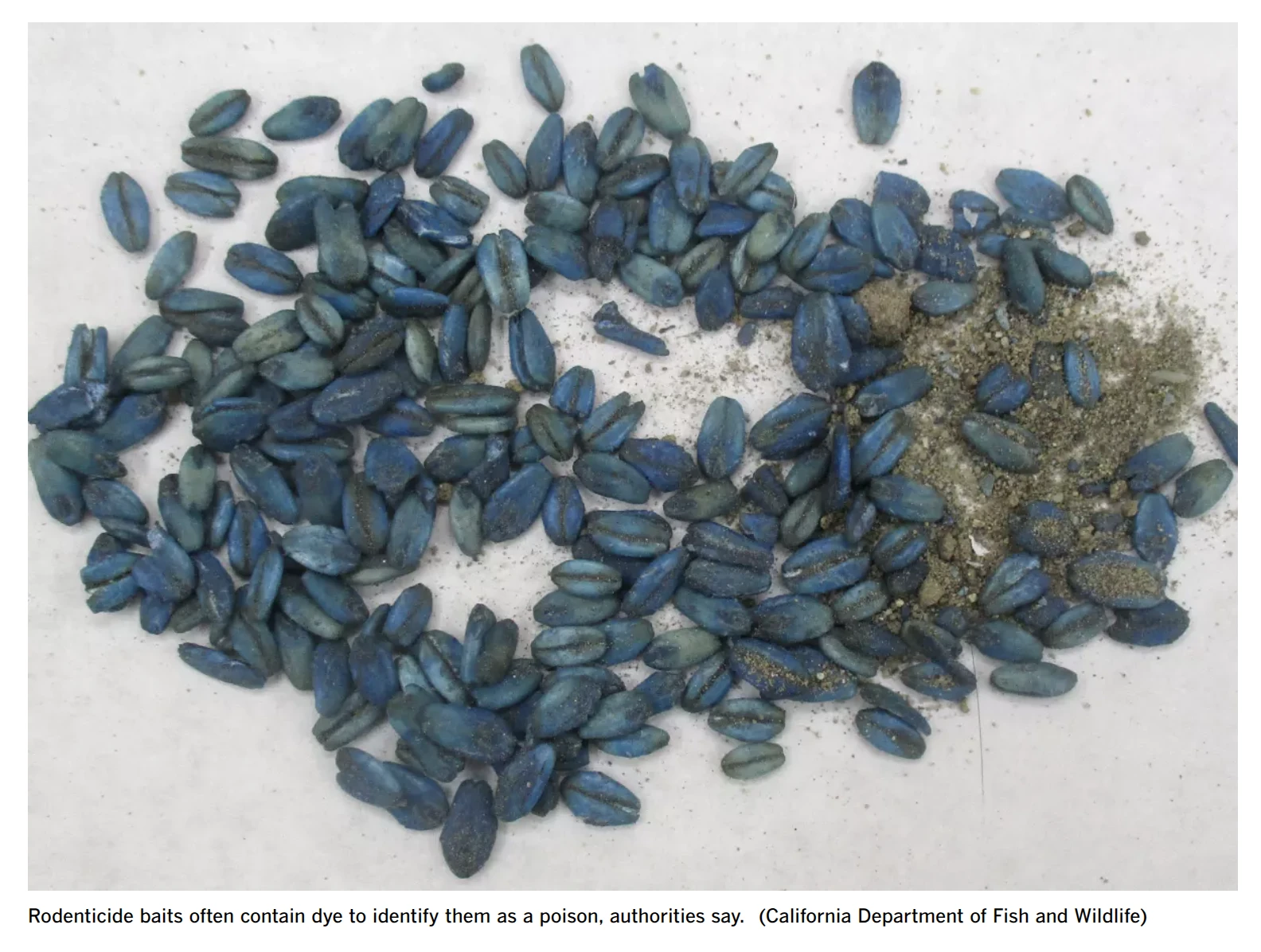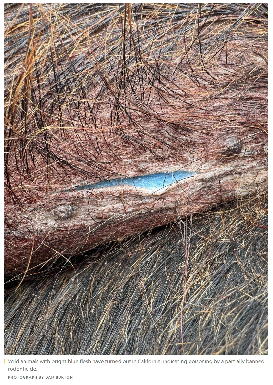 Media reports that in California, United States, has been found a Boars which have blueish meat fat and blueish meat pigmentation. It has been determinated that this Boars were eating Rodenticide baits which were used to kill small pests. The Rodenticide baits were containing poisonous diphacinone. California Department of Fish and Wildlife had said that they were aware of exposure of boars on rat poison since March, this year.