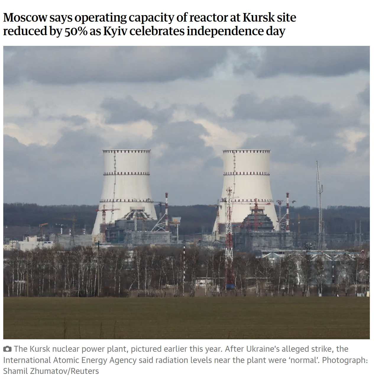 Auxiliary transformer of the Kursk Nuclear Power Plant, caught fire after Ukrainians drone strike. Russian authorities claims that debris from shot down drone fall on the power plant in the result damaging Auxiliary transformer. Operation capacity reactor has been reduced to 50%. There is no reported radiation in the area of Kursk Nuclear Power Plant, which is out of accepted norm likewise no casualties has been reported. Normal level of radiation was confirmed by United Nations nuclear watchdog organization.