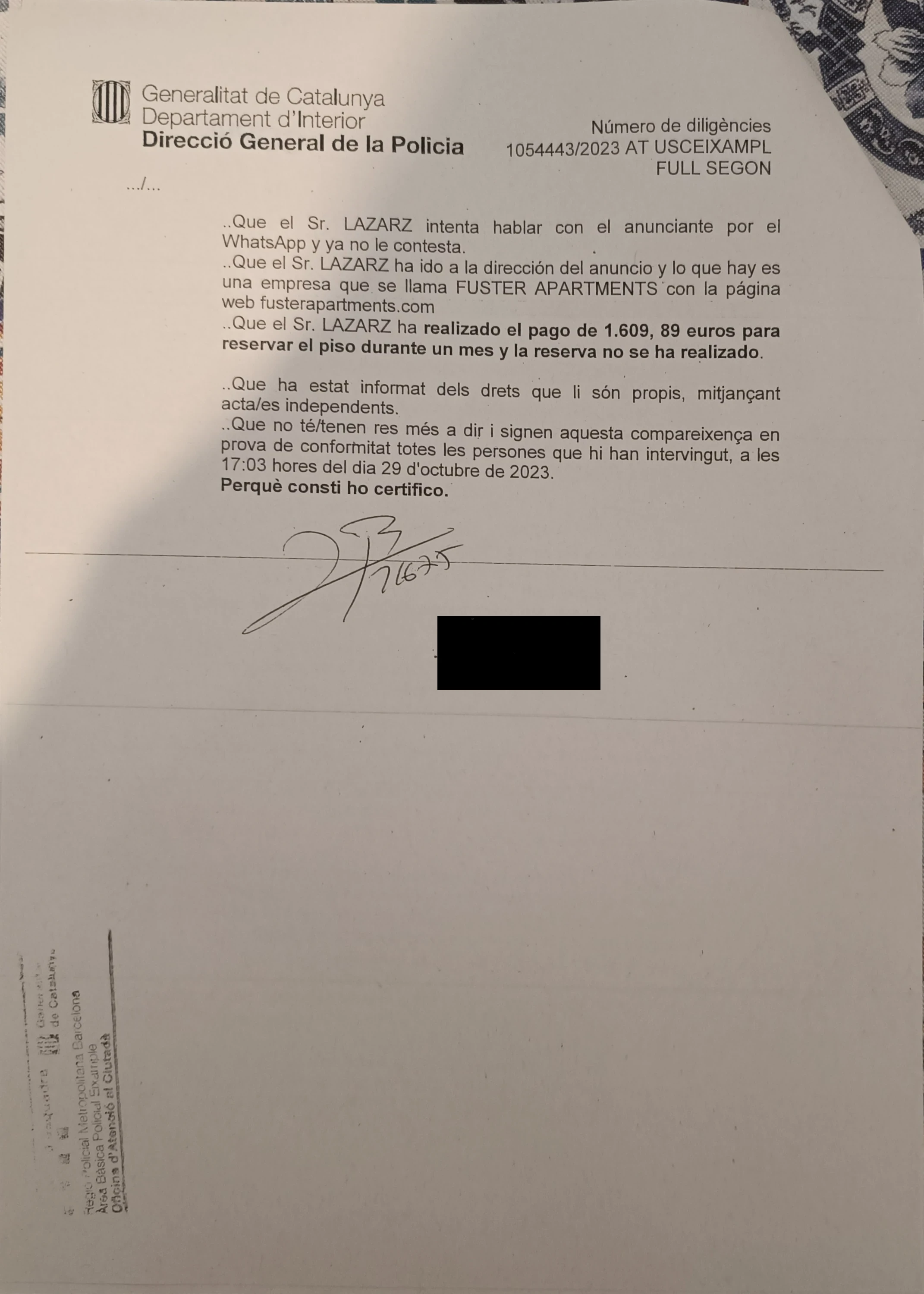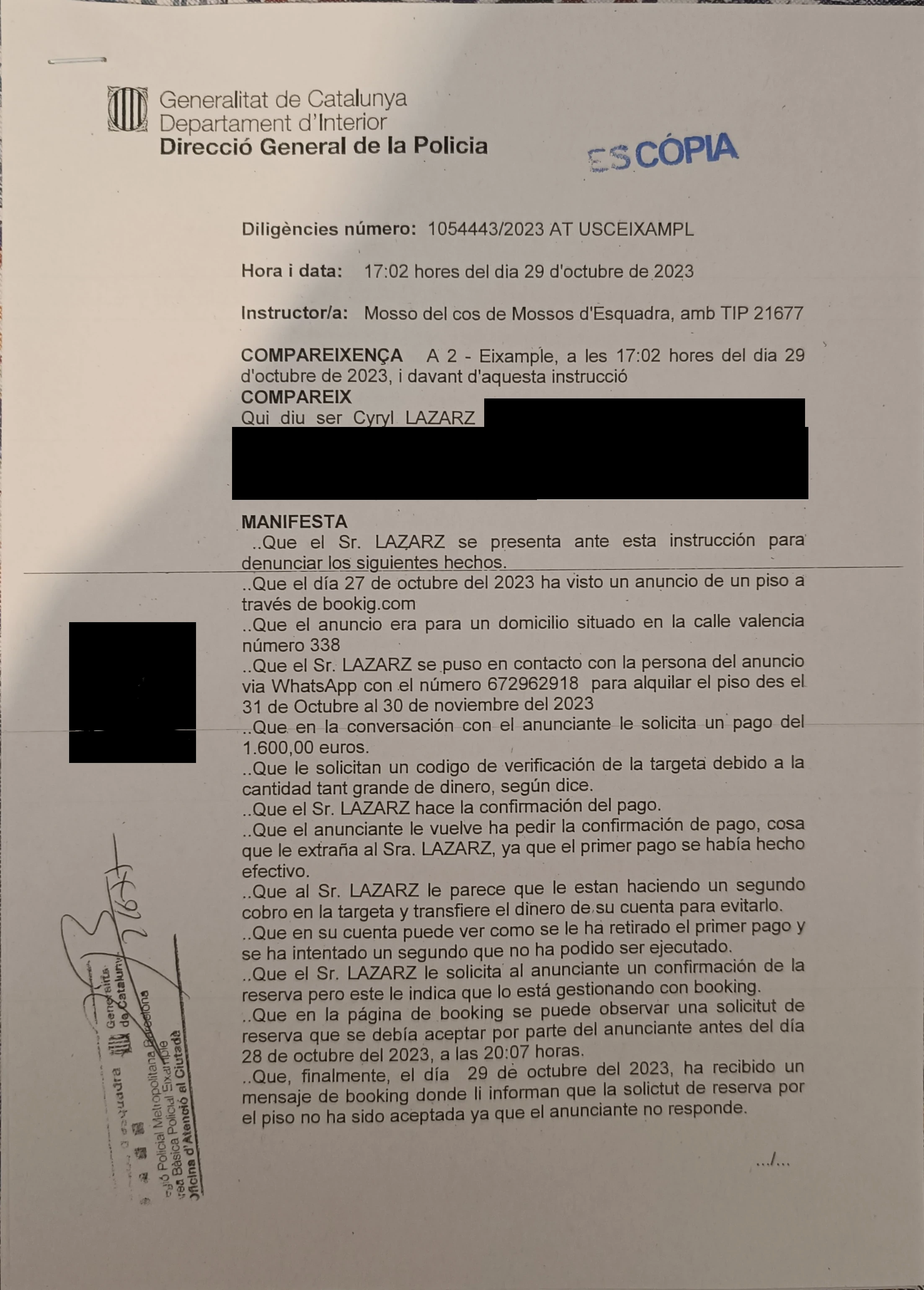 In Barcelona, Spain I had faced many difficult situations - potential frauds, starting from the hospitals trough ordinary robbery but the most sophisticated fraud had a place when I was force to abandon suddenly apartment I was renting. It tricked me women with a kid when I attempt to rent a new one. Police on many occasion weren't bothered seriously with nothing I was reporting to them. Also while attempting to recollect money from merchant - booking.com I met with drop call phone.