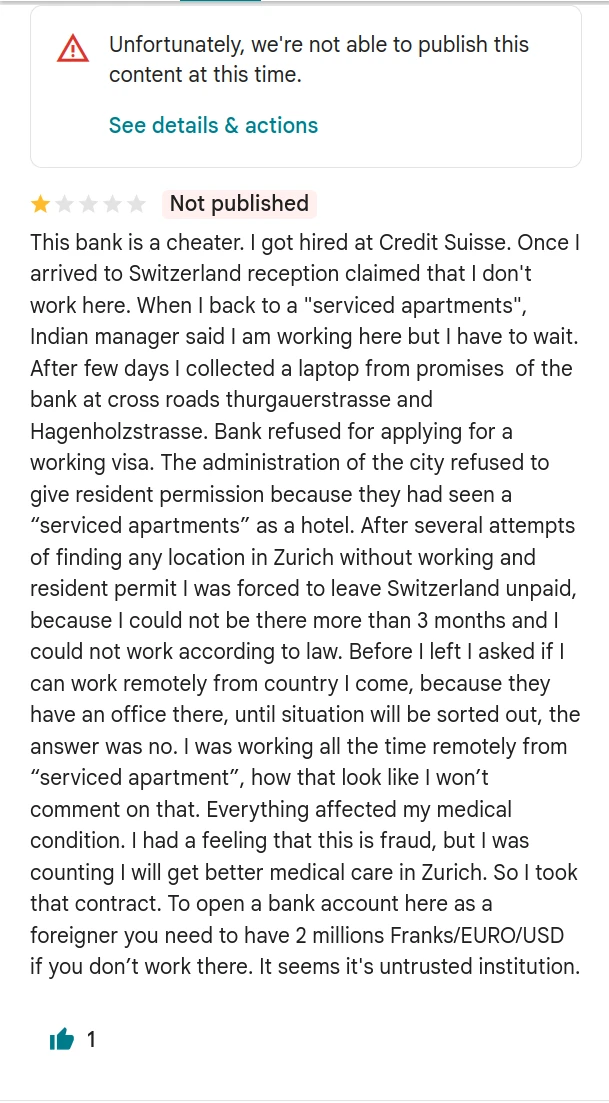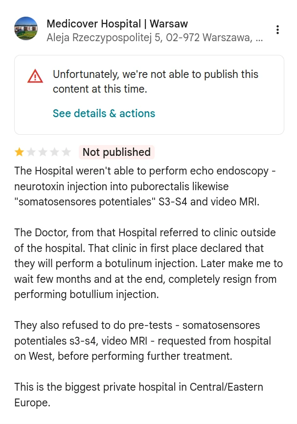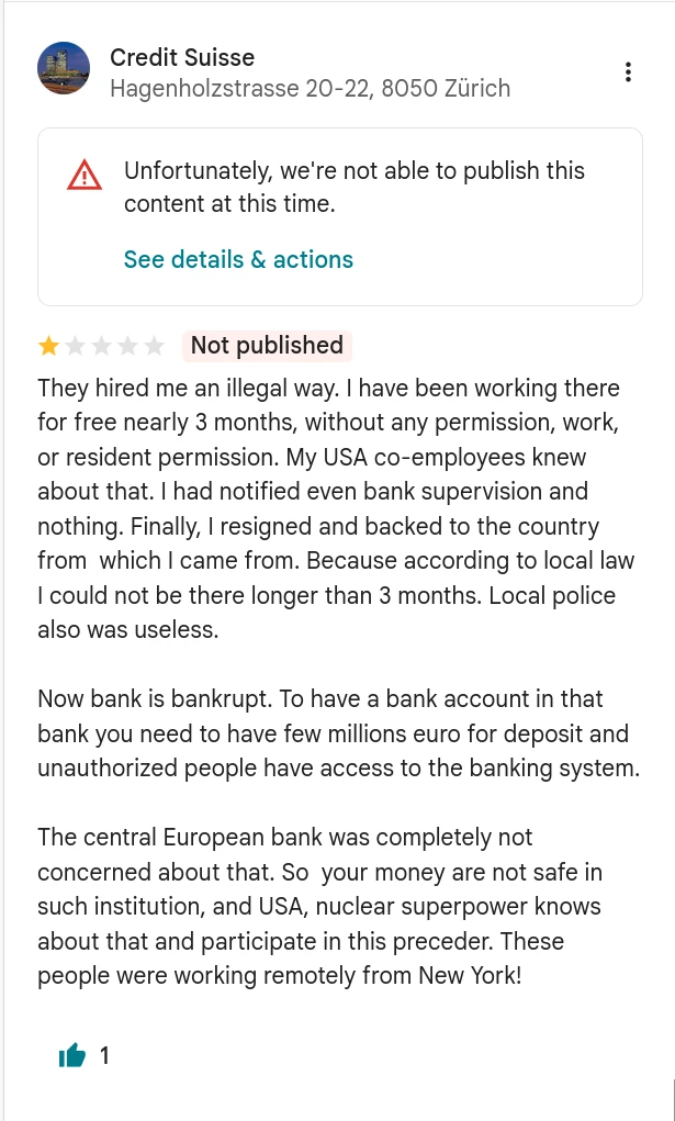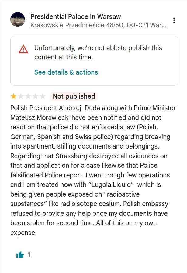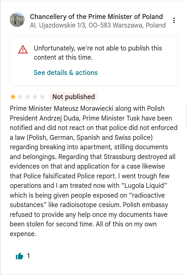 For whatever reasons Google blocks many of my reviews - true statement. I asked for statement from European Union Commission. No answer so far. Some of these reviews attached.