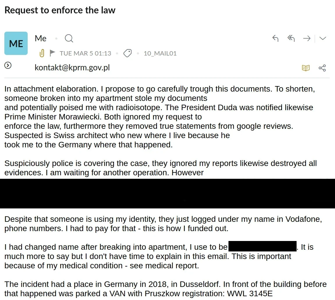 Few years ago I faced and incident in Dusseldorf, Germany. Someone broke in into rented by me apartment and stolen documents of mine. This would not be a big thing if shortly after I was at the hospital. My treatment took nearly 6 years until it has been founded out “the right method of treatment”. In meantime authorities refused to raise investigation. I decided finally due to absolute lack of interest from law enforcement forces to notify the highest authorities – no effect.